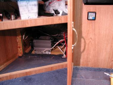 This project started by removing the old converter, which was behind a panel under the sink. The panel was very easy to remove, Coachmen used tiny headless nails to hold it in (a method used throughout the camper, which is in my opinion poor construction technique, but that is another story...). I disconnected three conductors, the 120v plug and four screws and it was out. I transferred the wires directly to the new converter and tested it out. Then I mounted it as in the picture below. I also mounted the Charge Wizard to the panel under the oven for easy access.