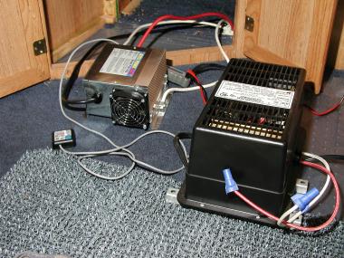 The most bang-for-the-buck that I could find was the Progressive Dynamics PD9145, which I purchased from www.bestconverter.com. It included the Charge Wizard, which is an optional charge-control module which I think is a must buy item. With the Charge Wizard, the converter becomes a multi-stage charger that quickly replenishes a discharged battery (14.4v), then switches to maintenance charge (13.6v) then to a storage mode (13.2v) that does not boil the electrolyte from the battery. Every 21 hours it switches to 14.4v for 15 minutes to desulphate the battery and stir the electrolyte. Without the Charge Wizard, the PD9145 simply outputs 13.6v.